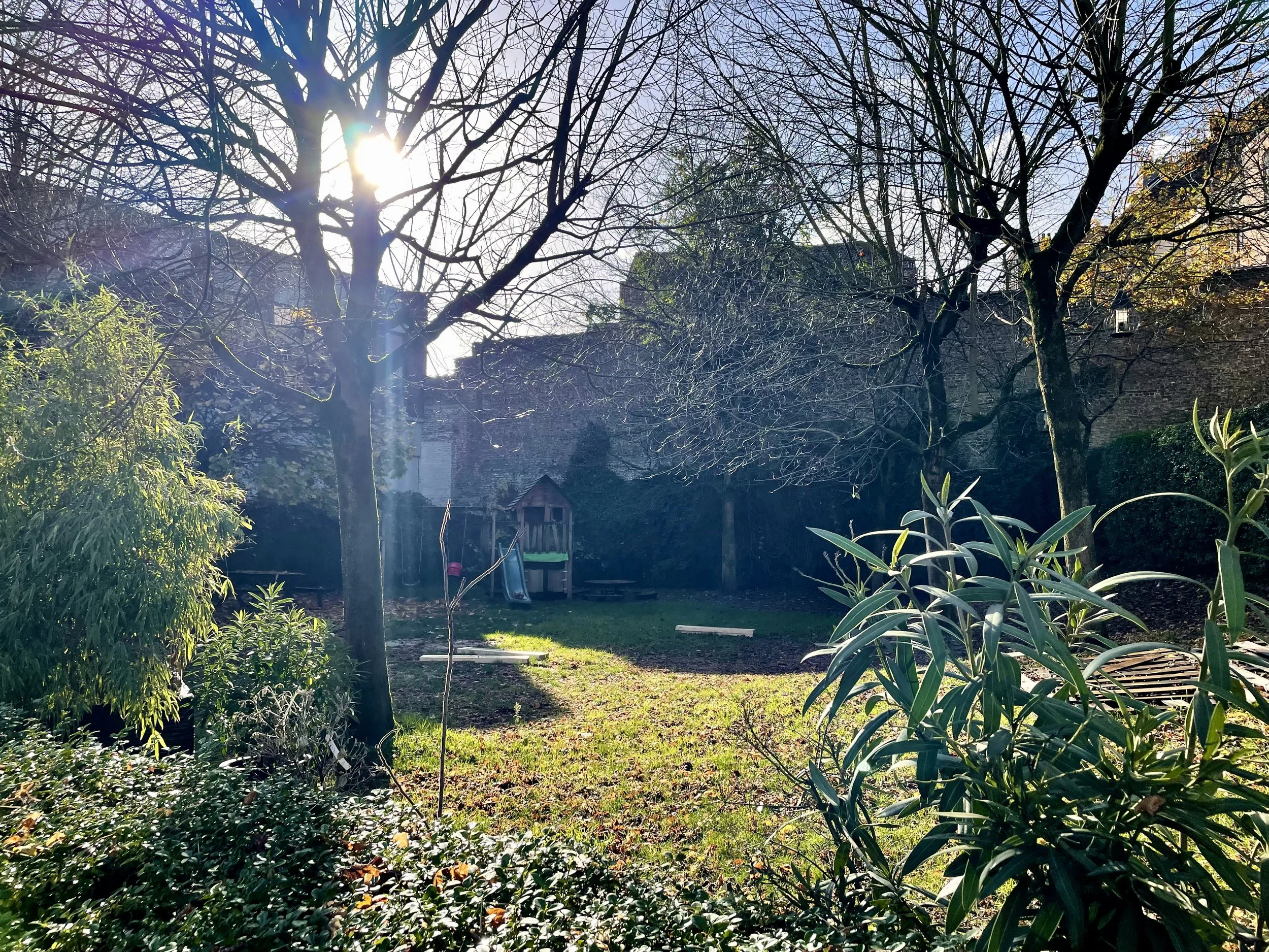 Beneden ligt een verrassend groene gemeenschappelijke tuin met picnicbanken en speeltuintje – een oase van rust in het hart van de stad.